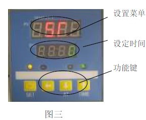 4.1 見圖三,按SET 鍵4 秒后,PV 屏顯示“ ”字符時,若SV 屏顯示“0”,表明未設定定時功能(出廠狀態)