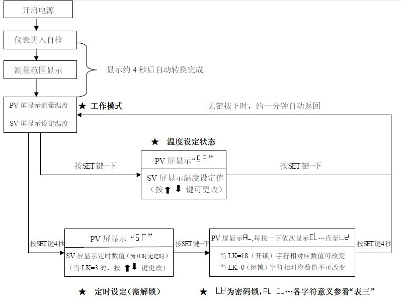 4.2 按SET鍵若干次,直到PV屏顯示“L K”,通過 鍵使SV 屏顯示3(定時開鎖),再按一下SET 鍵,PV 屏回到“ ”通過 鍵,設定定時所需值(定時范圍:1~9999 分),再按SET 鍵4 秒后,控溫儀返回工作模式,定時即開始運行,此時AT燈閃爍,進入計算時間。定時終了,PV 及SV 窗顯示“End”,AT 燈滅,蜂鳴器叫4次以示提醒;
