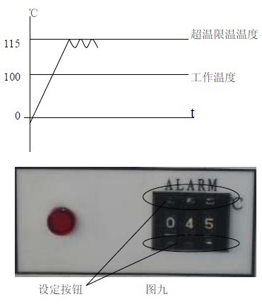 11.2 見圖九,用面板上超溫設(shè)定撥盤的+、— 按鈕進行設(shè)定所需限溫溫度。